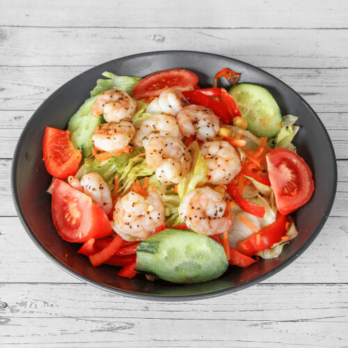 mit gemischtem Salat und gebratenen Scampis in Knoblauchöl